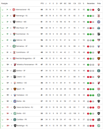 O Internacional segue na ponta, com 66 pontos ganhos. Após nove rodadas de vitória, o time gaúcho acabou derrotado para o Sport Recife nesta semana.
